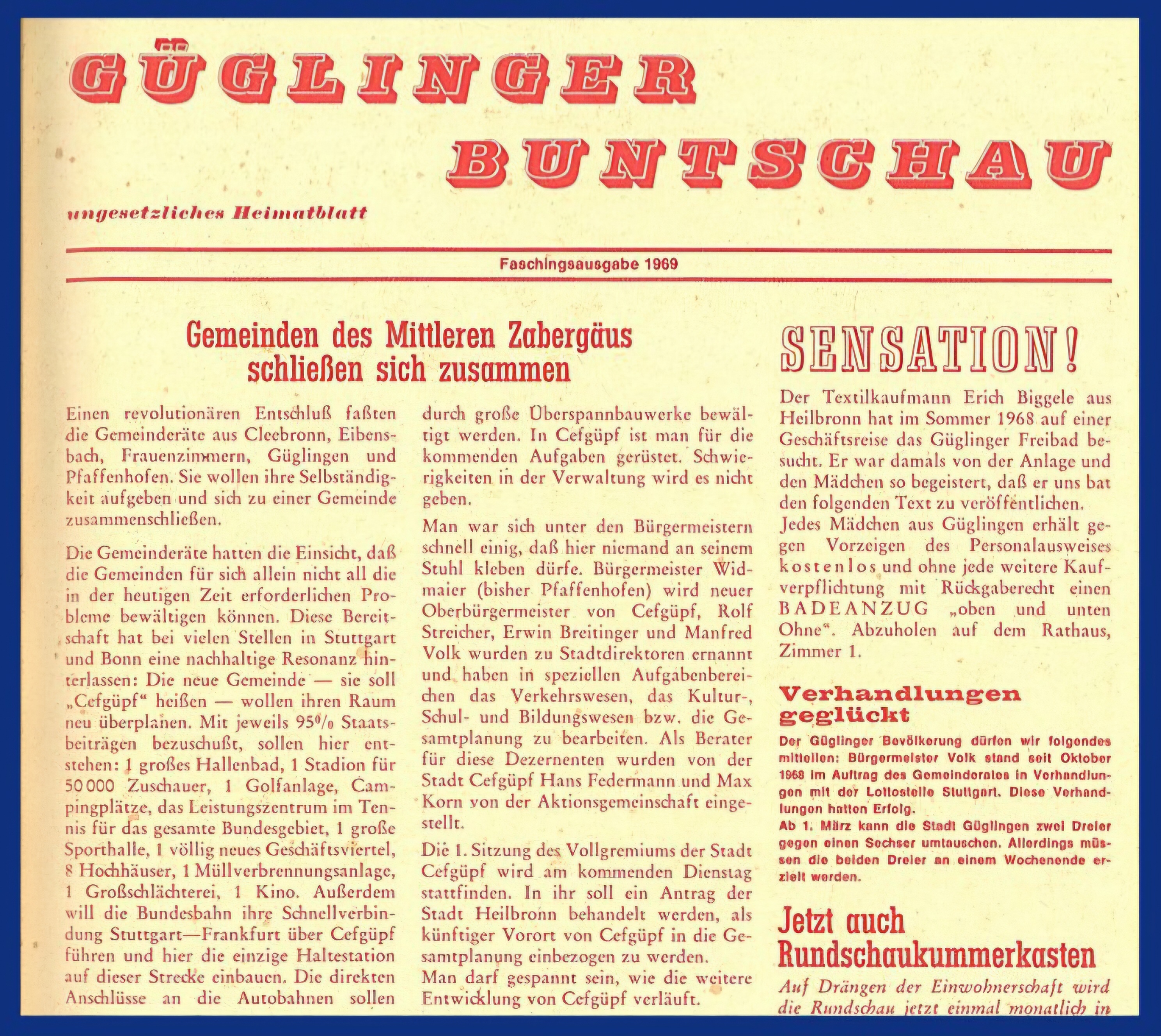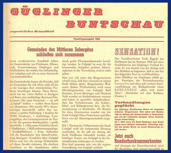 In der Faschingsausgabe 1969 der „Güglinger Buntschau” konnte man vom „revolutionären Entschluss” der Gemeinden Cleebronn, Eibensbach, Frauenzimmern, Güglingen und Pfaffenhofen lesen, eine neue Gemeinde zu bilden: Cefgüpf! Mit einer Infrastruktur wie eine wohlhabende Großstadt.