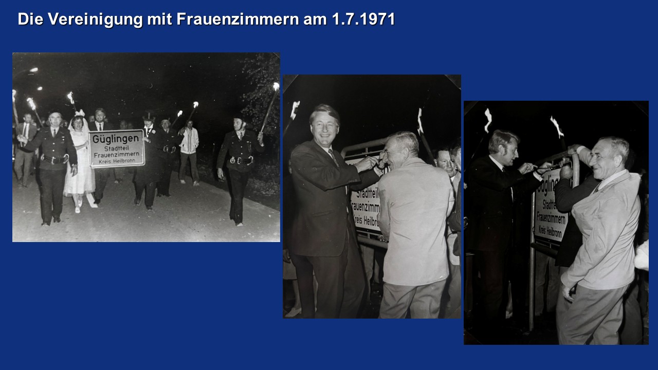 Nach positiven Bürgeranhörungen unterschrieben Bürgermeister Breitinger und Manfred Volk, bisher Amtsverweser von Frauenzimmern und am 30.3.1971 im „Ochsen” als Bürgermeister von Güglingen verpflichtet, in einer öffentlichen Feierstunde am 1. Juli 1971 ebenfalls im „Ochsen” die Vereinigung der beiden Orte. Die Festansprache hielt Innenminister Walter Krause. In der Nacht vom 30.6. auf den 1.7. marschierte ein Fackelzug zum Ortsschild von Frauenzimmern, um es auszutauschen. Bei der Firma Schneider gab es Freibier für alle!