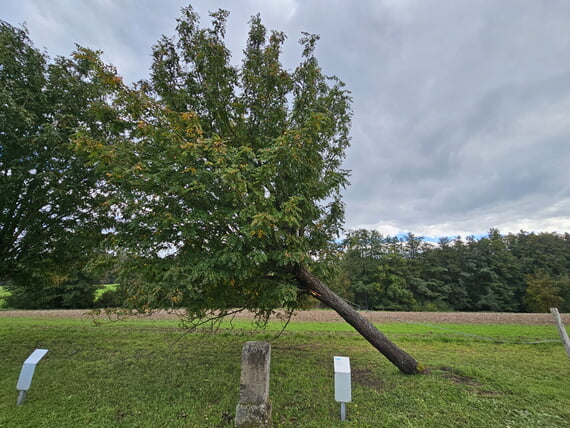 Neben den Steinen erregte jedoch noch etwas völlig anderes das Interesse der Gruppe: ein sehr schräg gewachsener und daher gestützter Speierling voller Früchte. Viele noch ansehnliche Früchte lagen schon im Gras und luden einige Mutige ein zum Probieren. Fazit: Sie sind keineswegs zum “Speien”, wie der Name suggeriert.